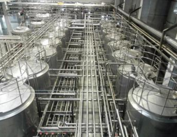 酸罐、碱罐、多个水罐以及泵和阀组等组成的清洗系统